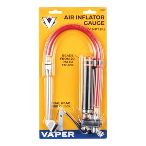 The TITAN professional garage style inflator has a 20 In. overall length, dual head tire chuck, a 20-140 PSI gauge, and a 1/4 In. NPT.