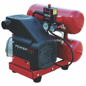 The Power Pro HP twin tank air compressor features a Powerful 2 HP Motor, Air Pressure Setting 85 to 125 PSI, Maximum Pressure 125 PSI, Automatic Pressure Release at 140 PSI, Oil Lubricated Pump, and a Metal Air Filter.