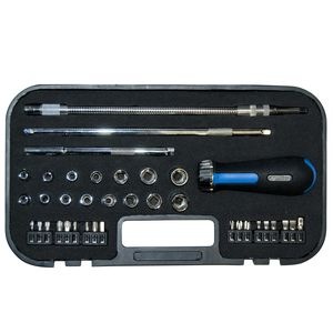 Package Contents: One Ratcheting Handle, 17 Bits, One Socket Adapter, 15 Sockets, Three Shafts